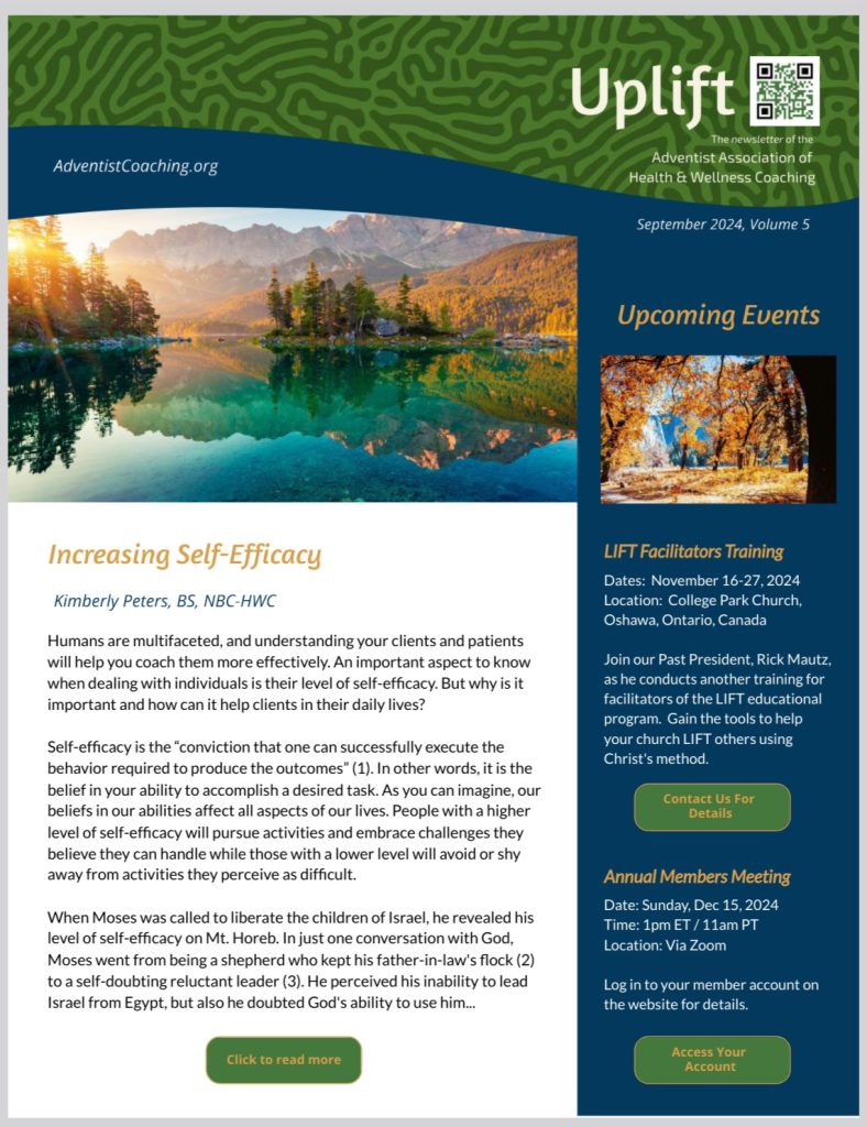As a member and writer for The AAHWC (The Adventist Association of Health & Wellness Coaching), I wrote an article on how Christian health coaches can help their clients and patients increase their self-efficacy. If you would like to read the full article, download from my featured page: